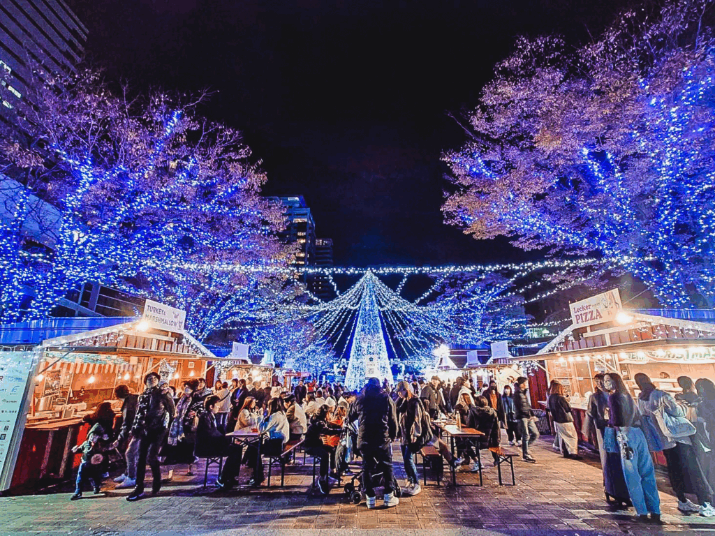 イルミネーションに包まれた“ゲート”をくぐると、そこはまるで海外のクリスマスマーケット。温かいホットワインやグルメ屋台、ライブ演奏などが広場いっぱいに展開され、家族連れや友達同士、デートにもぴったりな雰囲気です。