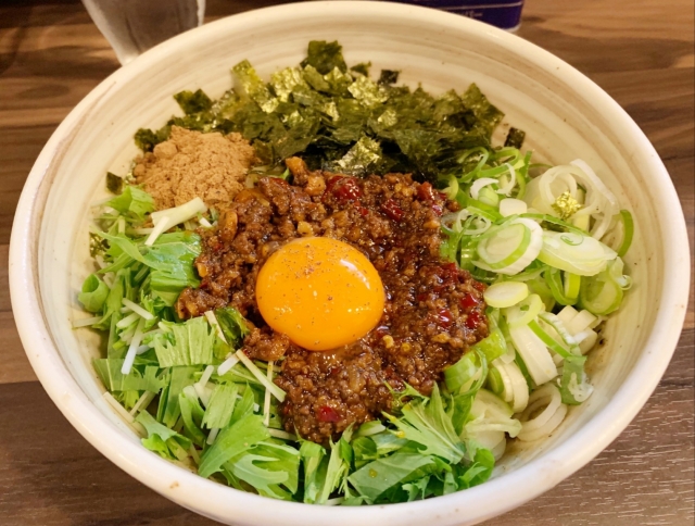 とろりと濃厚な卵黄と肉味噌、ネギ、刻み海苔などのトッピングが絶妙なバランスで配置され、麺としっかり混ぜ合わせることで完成される一杯です。もちもちの太麺に甘辛のタレが絡み、深みのある味わいが口いっぱいに広がります。