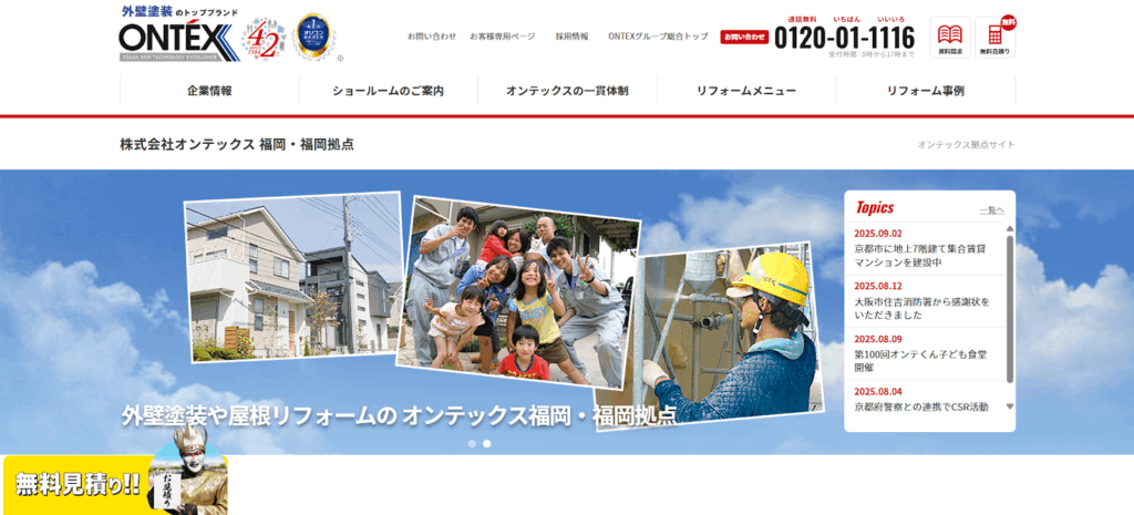 オンテックス福岡・福岡拠点は、全国に拠点を持つ住宅リフォーム業界大手「オンテックス」の九州支店として、福岡を中心に質の高い外壁・屋根塗装サービスを提供しています。上場企業ならではの安心感と組織力を活かし、累計施工実績は全国で18万件以上。