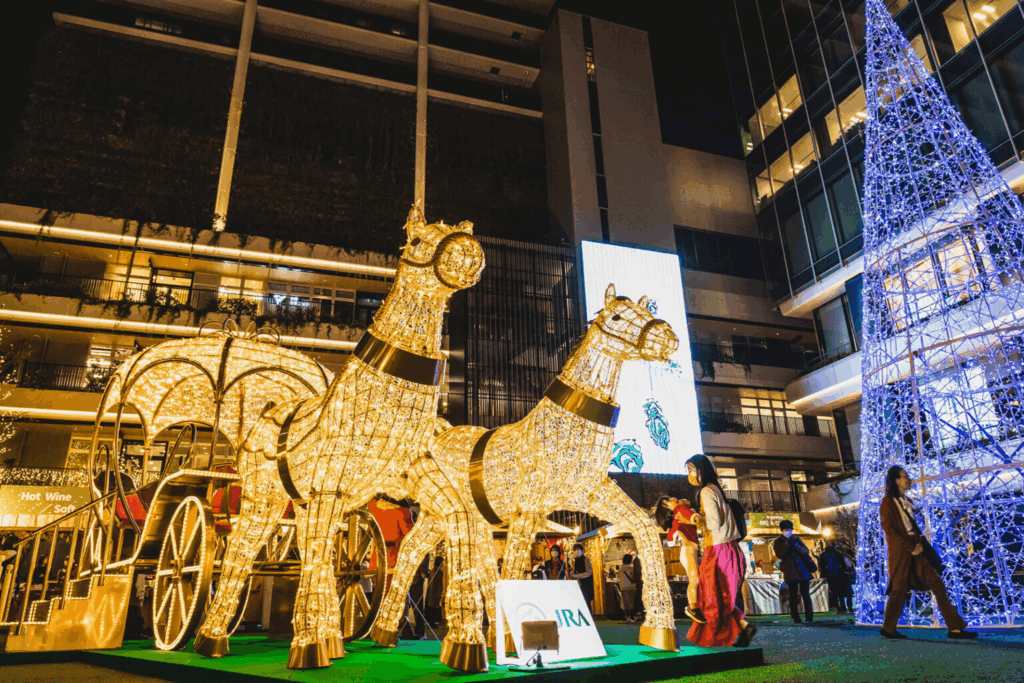 毎年11月中旬から12月25日まで開催され、シャンパンゴールドを基調としたイルミネーションが芝生広場を包み込み、訪れた人々をロマンティックな気分へと誘います。