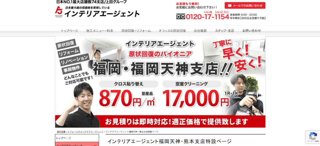 インテリアエージェント福岡天神支店は、クロスの張り替えや水回り設備の更新をはじめ、原状回復から本格的なリフォームまで幅広く対応する施工会社です。特に、賃貸住宅やオフィス、商業施設の施工実績が豊富で、現場対応力と提案力に定評があります。
