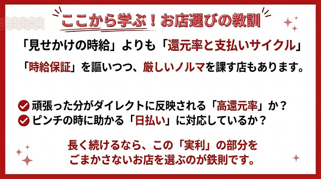 さらに取材中、実際に「全額日払い」で報酬を受け取って帰る女性を目撃しました。「今日は急な飲み会が入ったので、その分だけ稼ぎに来ました」と笑顔で話す学生さん。この即金性の高さは、アリスならではの強みだと感じました。