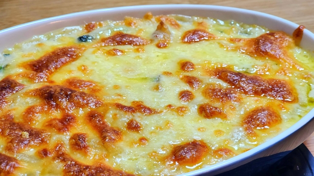 熱々でクリーミーなグラタンは、器から溢れそうなチーズの存在感と合わせて、写真映えもばっちりです。