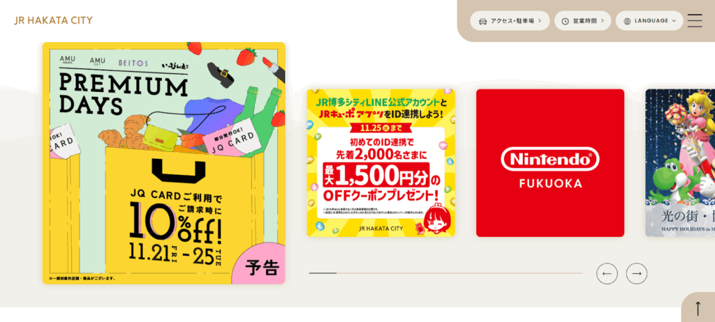 さらに、九州初出店のブランドも多く揃っており、トレンドを意識した買い物を楽しめるのが魅力です。駅直結の利便性から、電車移動の合間にも立ち寄りやすく、時間を有効に使いたい方にもおすすめです。