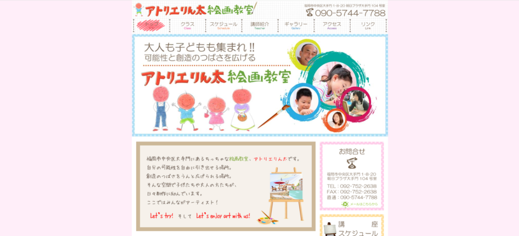 「楽しく描くこと」がモットーのアトリエりん太絵画教室は、大濠公園近くの落ち着いた住宅街にある、温かみのある絵画教室です。3歳から通える子どもコースと、大人向けのコースがあり、幅広い年代に対応しています。