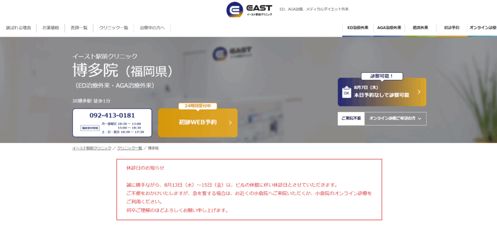 | 店舗名 | イースト駅前クリニック博多院 |
