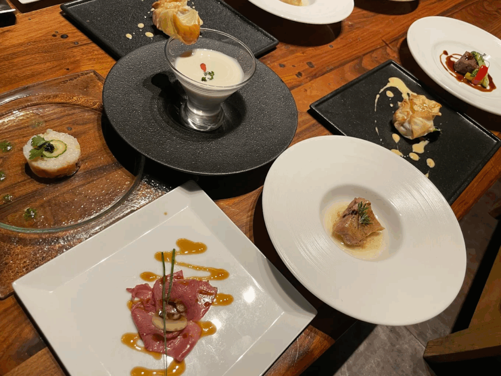 料理は九州の旬の食材を使ったアラカルト中心の構成で、40種類以上の豊富なメニューから好みに合わせて自由に選べるスタイル。手間を惜しまない丁寧な仕込みと、見た目も美しい一皿一皿が、ワインとの相性をより引き立てます。