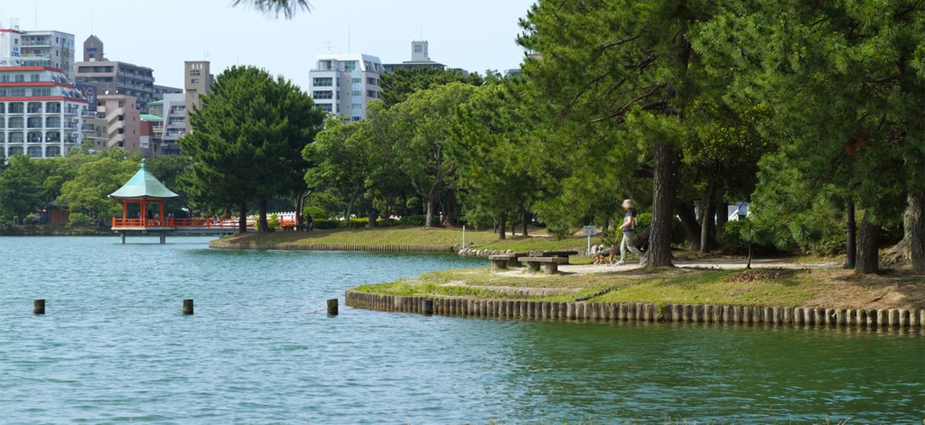 また、かつて福岡城の外堀として整備された歴史を持つ場所であり、美術館や日本庭園など文化施設も併設されています。