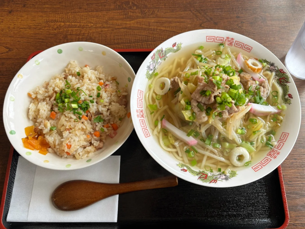 昔ながらの雰囲気漂う店内で提供されるちゃんぽんは、クリーミーな豚骨スープに、もっちりとした太麺、たっぷりの野菜とエビ・キクラゲなど具材がぎっしり詰まった一杯。見た目以上に軽やかな後味で、最後まで箸が止まりません。