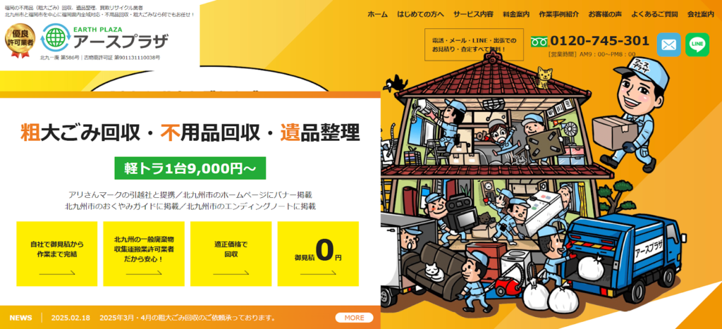 「アースプラザ」は、北九州市小倉南区に本社を構える不用品回収・遺品整理の専門業者です。出張費・見積もり費用が無料で、1点からの回収にも対応しているため、小規模な依頼でも気軽に相談できます。