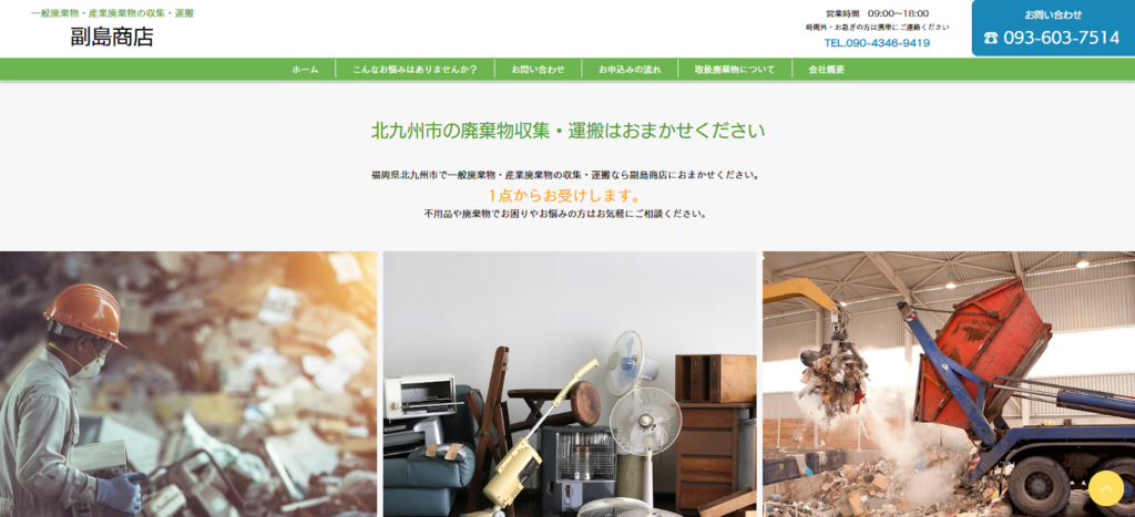 「副島商店」は、北九州市八幡西区に拠点を構える廃棄物処理と不用品回収の専門業者です。創業からの実績が豊富で、一般廃棄物・産業廃棄物収集運搬の許可を取得しており、家庭から企業まで幅広い依頼に対応しています。