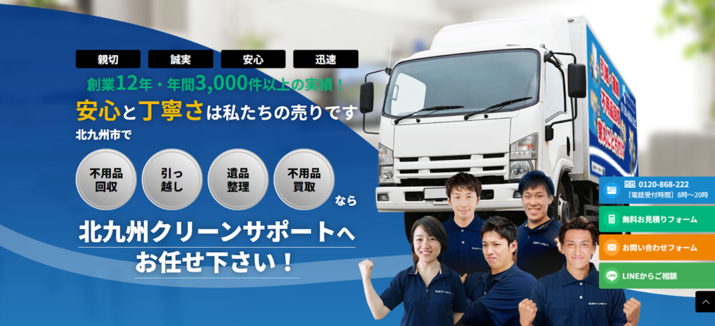 「北九州クリーンサポート」は、八幡西区を拠点に北九州市全域に対応する不用品回収・粗大ゴミ処分の専門業者です。特徴は、軽トラパックや定額回収プランなど、ニーズに応じた明朗な料金体系。