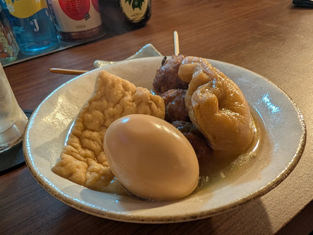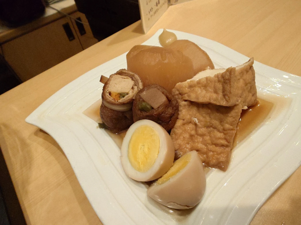 昆布と鰹をベースにした澄んだダシに、手間ひまかけて煮込まれた具材がじんわりと溶け合い、一口ごとに旨味が広がります。大根やちくわぶなどの定番から、創作系の変わり種までバリエーション豊富で、何度訪れても飽きないのが魅力。