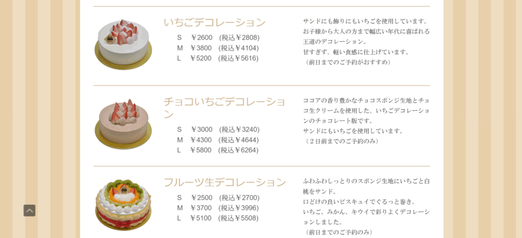 華やかさよりも“優しさ”や“安心感”を大切にしたケーキ作りが魅力で、小さなお子さまがいる家庭にもおすすめ。予約は早めに済ませておくと安心です。