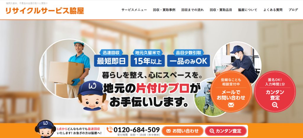 | 店舗名 | リサイクルサービス脇屋 久留米市の不用品回収 遺品整理 ゴミ屋敷片付け業者 |