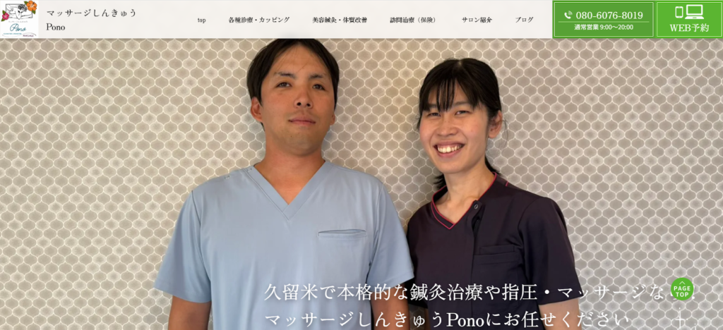 「マッサージしんきゅうPono」は、久留米市小頭町にある完全予約制のプライベート鍼灸マッサージサロンです。