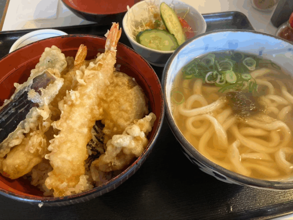 特に寒い時期は、あたたかい「天ぷらそば」や「かしわうどん」が人気です。ボリュームある定食メニューや、丼ものとのセットも充実しており、食事としても大満足の内容。