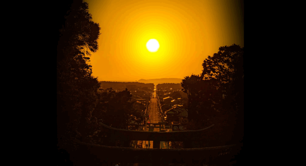 特に有名なのが、参道の先に夕陽が一直線に差し込む「光の道」。この神秘的な光景は毎年2月と10月に見られ、多くの参拝客を魅了します。初詣の時期には、美しい境内の装飾と共に厳かな雰囲気が漂い、一年の始まりにぴったりの場所として人気です。