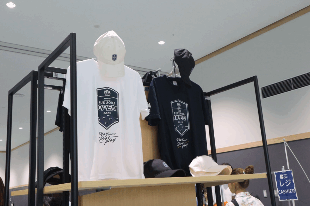 Tシャツやキャップ、フェイスタオルなど、観戦の思い出としてはもちろん、実際のプレーにも使えるアイテムが揃っています。特に「Sansan FUKUOKA OPEN」のロゴ入りTシャツは注目度が高く、多くの来場者が手に取っていました。