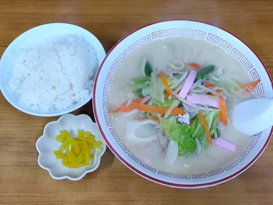 ちゃんぽんは、あっさりした和風寄りのスープにたっぷりの野菜、豚肉、かまぼこなどが乗った優しい味わい。見た目は派手ではないものの、どこか懐かしさを感じる、ホッとする一杯です。