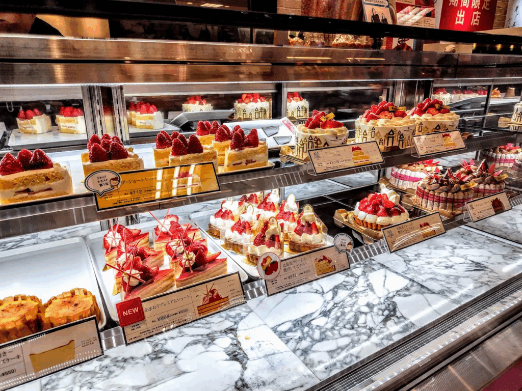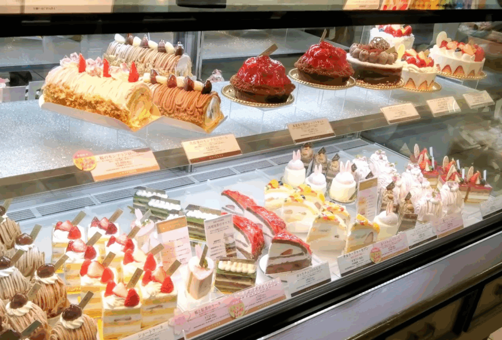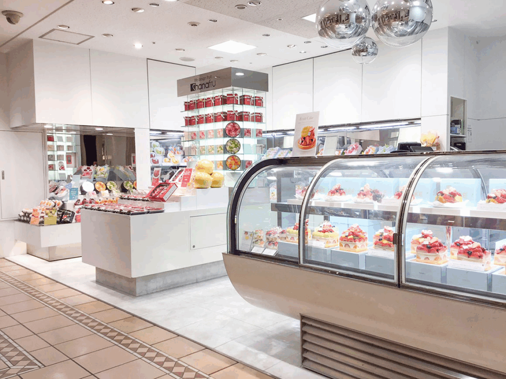 福岡三越店では、鮮度抜群のフルーツを贅沢に使用したタルトやショートケーキが並び、クリスマスシーズンには彩り豊かな限定ケーキが登場。