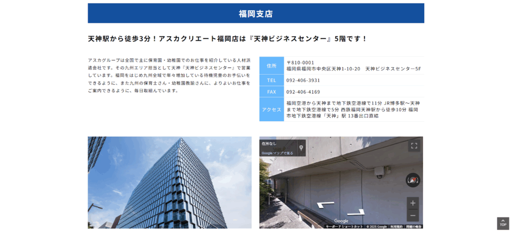 福岡支店は、天神ビジネスセンターの好立地にあり、保育士・幼稚園教諭・看護師・栄養士などの専門職に向けた求人を豊富に扱っています。
