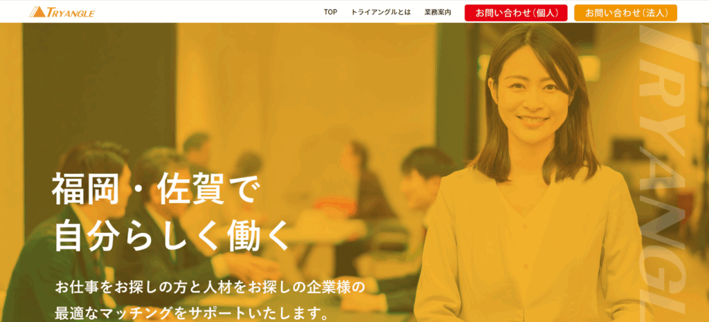 株式会社トライアングルは、福岡・天神に本社を構える、求人広告を中心とした総合人材サービス企業です。アルバイト・パート・正社員まで幅広い雇用形態に対応し、タウンワークやはたらいく、フロムエー、リクナビNEXTなど多彩な求人媒体を取り扱っています。