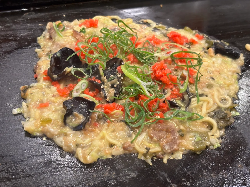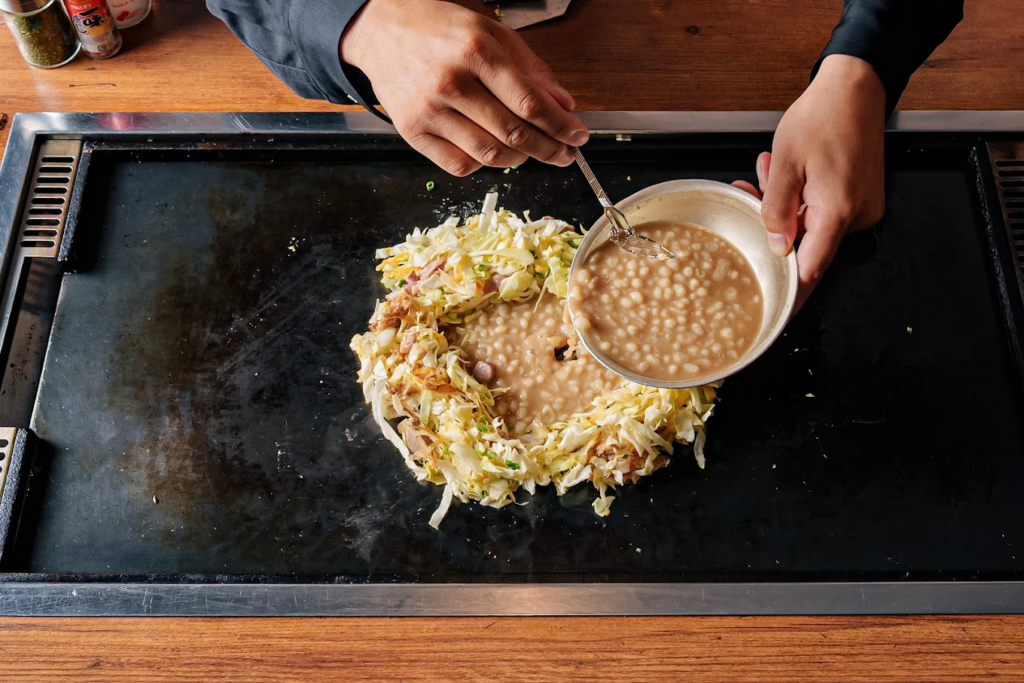 鉄板の上でジュワッと広がる香ばしさに、自然と会話も盛り上がります。スタッフが焼き方をサポートしてくれるので、もんじゃ初心者でも安心して挑戦できるのも嬉しいポイント。