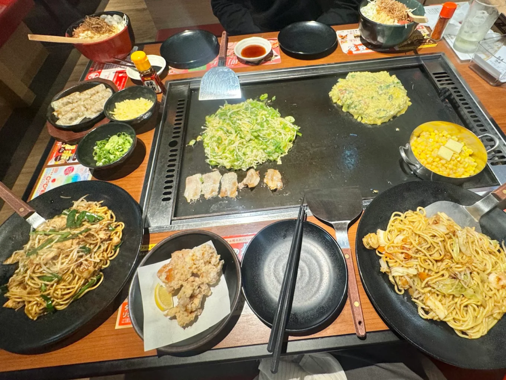 定番のお好み焼きや焼きそばはもちろん、鉄板で仕上げる一品料理も充実していて、飲み会や食事メインの利用、どちらにも対応できる柔軟さが魅力。