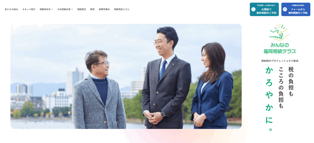 みんなの福岡相続テラスは、DIG税理士法人が運営する相続専門の相談窓口です。天神駅から徒歩圏内というアクセスの良さに加え、平日は夜21時まで対応しており、仕事帰りにも立ち寄りやすいのが嬉しいポイント。