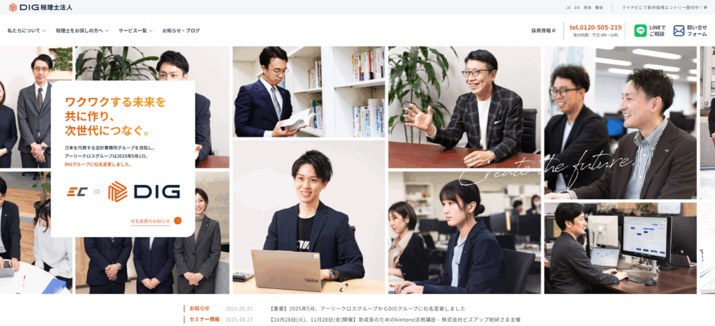 DIG税理士法人は、福岡・天神を拠点に全国7拠点を展開する総合型会計事務所グループです。創業間もない企業やスタートアップへの支援に強みを持ち、クラウド会計の導入支援やDX推進にも積極的に対応。