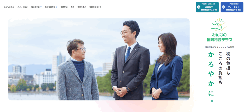 「みんなの福岡相続テラス」は、天神駅から徒歩約6分の場所に位置する相続専門の税理士事務所です。元国税職員を含む経験豊富なスタッフが在籍し、相続税の申告や生前対策に関する相談を時間無制限・無料で対応しています。