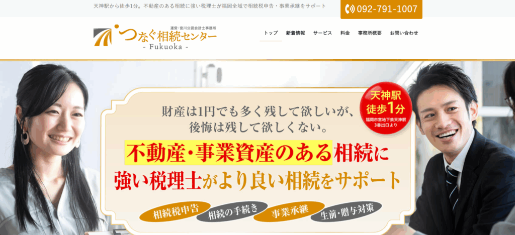 「つなぐ相続センター」は、福岡天神エリアの中心部に位置し、相続税申告や生前贈与、遺言書作成、事業承継などに幅広く対応している税理士事務所です。協和ビル6階に構えるオフィスは、天神駅から徒歩約3分とアクセスも抜群。