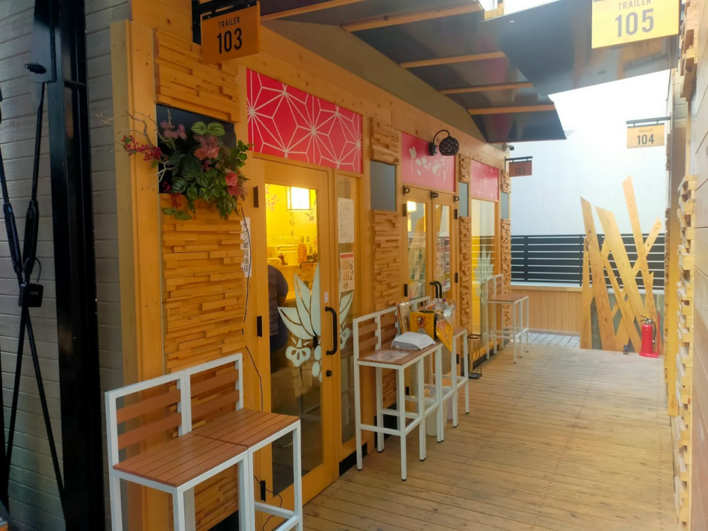 「たちのや博多」は、天神エリアでもひときわ目を引くトレーラーハウス風の外観が特徴の立ち飲みスポット。屋外テラスを備えた開放的な造りで、カジュアルかつおしゃれな雰囲気が若い世代にも人気です。