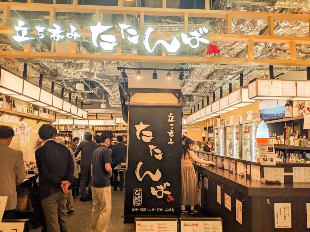 「立ち呑み たたんばぁ 福岡本店」は、天神ビジネス街の中心に位置するスタイリッシュで気軽な立ち飲みスポット。明るく清潔感のある店内には立ちカウンターと小テーブルがあり、一人飲みから軽いグループ飲みまで対応可能です。