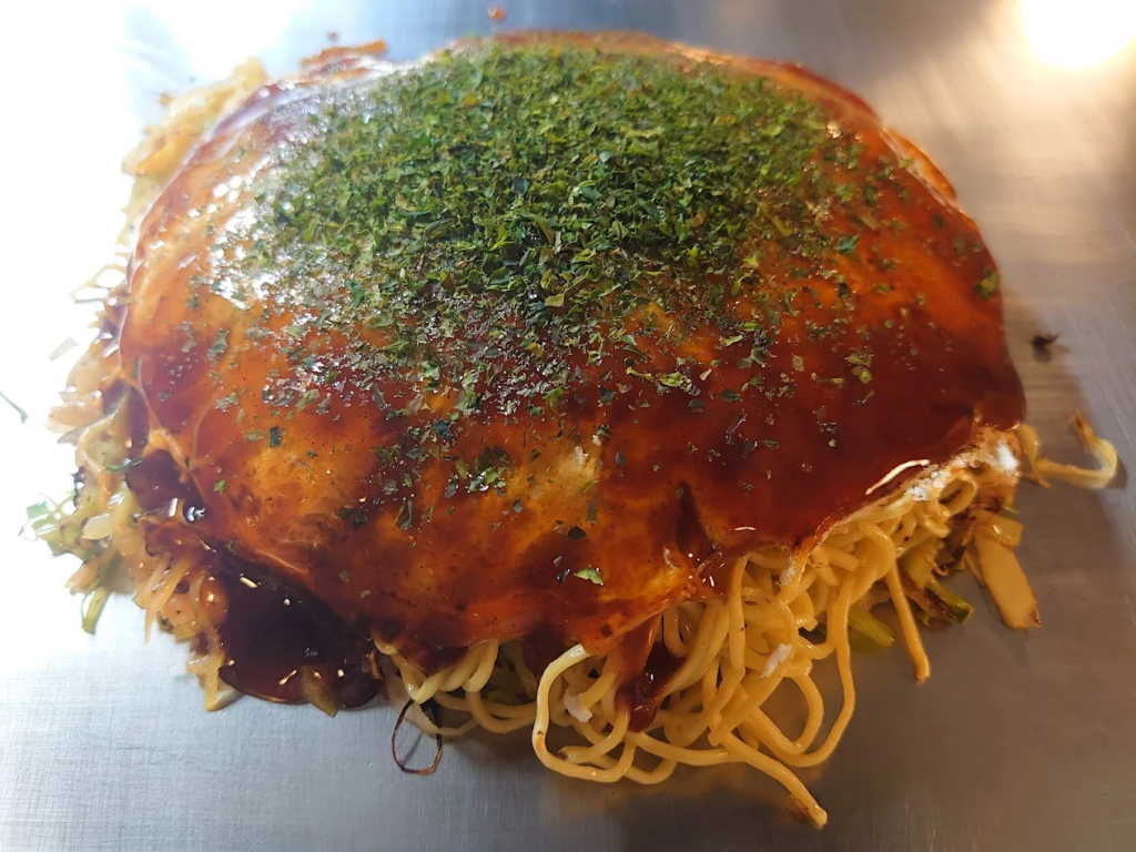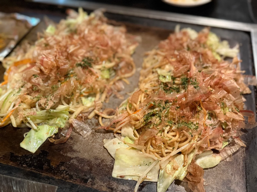 鉄板でじっくり焼き上げることで、香ばしさと具材の旨味が凝縮され、ソースの甘辛さが絶妙にマッチ。キャベツのシャキシャキ感や、豚肉のジューシーさも相まって、一皿で大満足の仕上がりです。